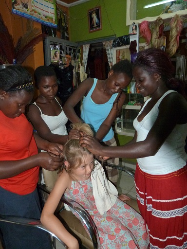 Nous avons testé les coiffeuses ougandaises, pas assez douces selon Marianne mais très motivées quand même : à 4 sur les cheveux de Marianne elles ne se sont pas arrêtées une seconde...