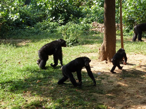 Nous avons aussi salué les chimpanzés, ils ont apprécié notre lancer de bananes. Mais là, la distribution est terminée.